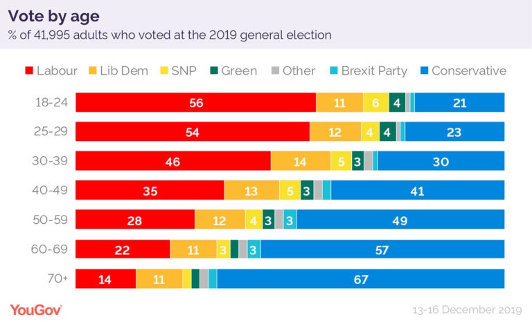 Politics, in wealthy countries, is increasingly becoming a war between the generations. While the support for smaller parties in the UK (Liberal Democrats, Greens, the Scottish National Party, even Brexit) is constant across ages, the split between Labour and Conservative is almost entirely based on age cohort: