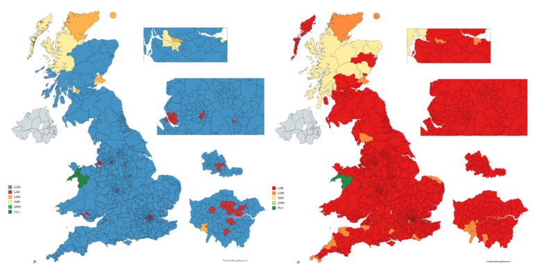 Electoral maps of the UK based on projected results of opinion polling from 2018 if, respectively, only over sixty-five year-olds (left) or only eighteen-to-twenty-four year-olds (right) were allowed to vote; click to expand