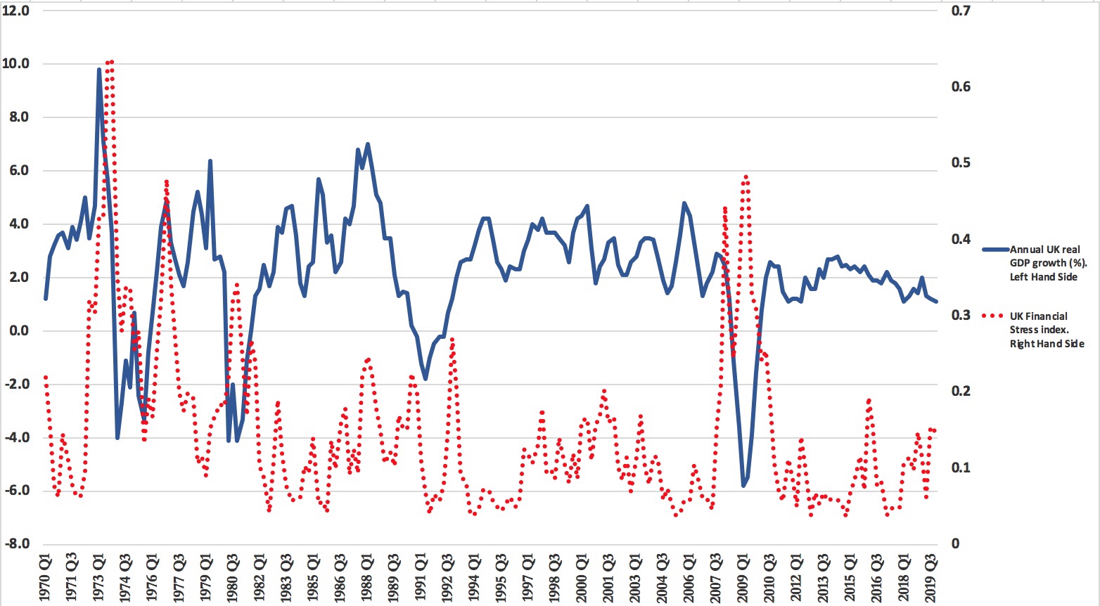 Figure 1: UK GDP growth and financial stress, 1970-2019