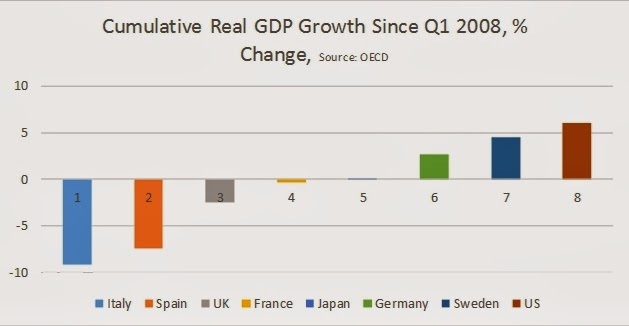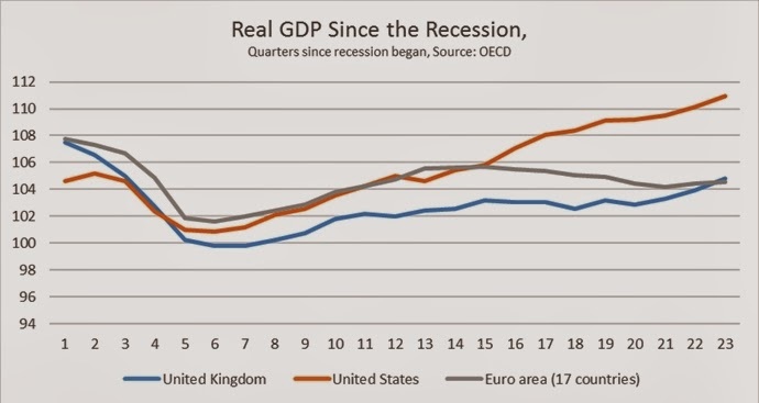 The level of real GDP in Britain since the recession began at the beginning of 2008 is shown in the chart below. It is compared to the US and the Euro Area. British growth has been almost exactly the same as that of the Euro Area as a whole and significantly worse than US GDP growth.