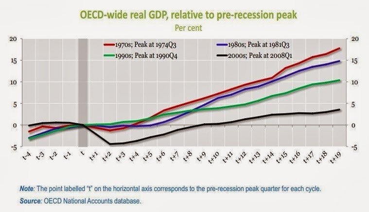 Authoritative economists such as Larry Summers (video) and Gavyn Davies and others have instead been discussing the ‘secular stagnation’ of the industrialised economies. Paul Krugman wonders whether this is ‘a permanent slump’.